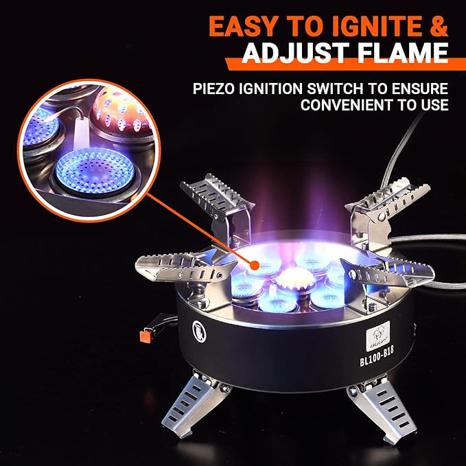 - Easy to Ignite & Adjust Flame: The camp stove has a piezo ignition switch to to ensure convenient to use.You just need press the ignition switch to ignite,no extra flint needed; With the horizontal air inlet tube for a lower center of gravity, more stable hold and less risk of the pan tipping over.