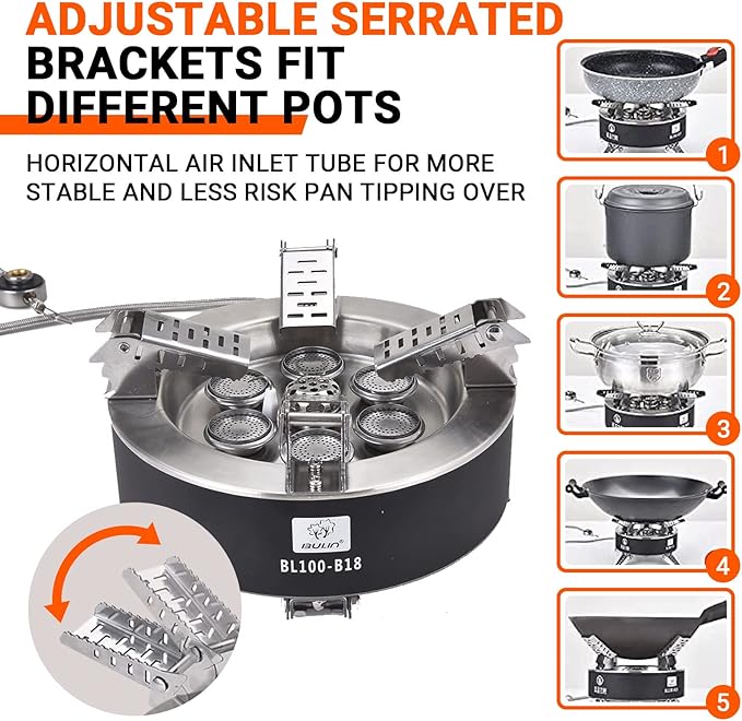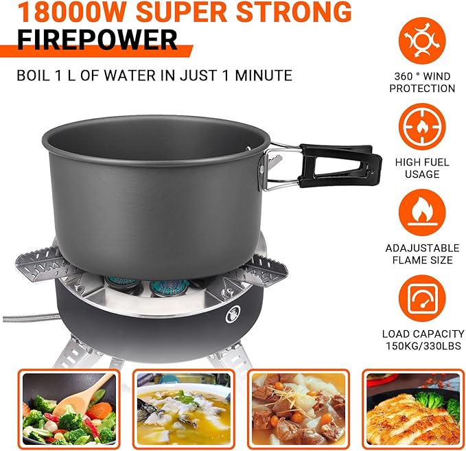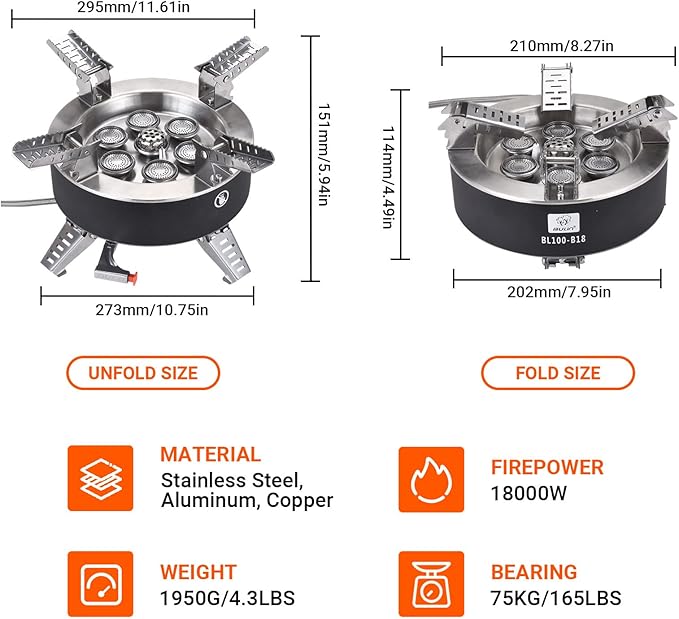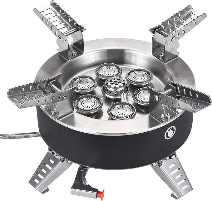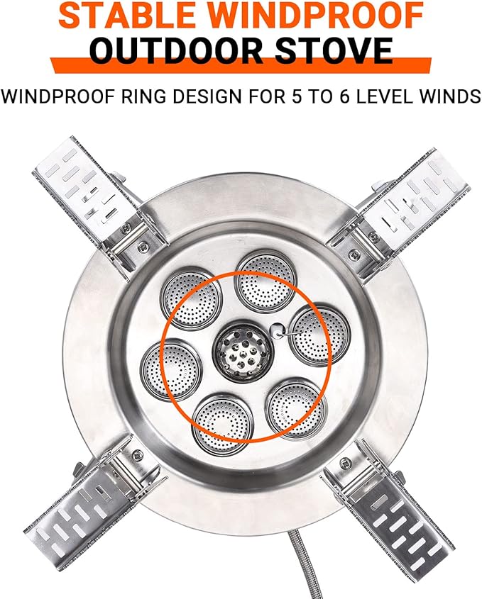 - High Cooking Performance-Save Your Fuel: The firepower of the camping stove is 18000W super strong firepower, 7 Burners which allows you to boil 1 L of water in just 1 minute, cook your meal very quickly. Windproof design helps the efficiency of your stove ,greatly save fuel.