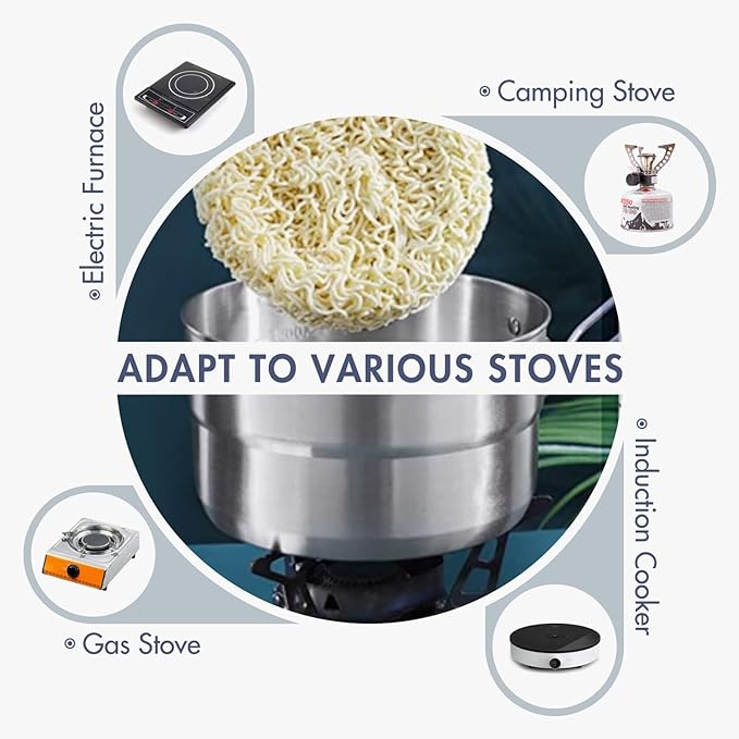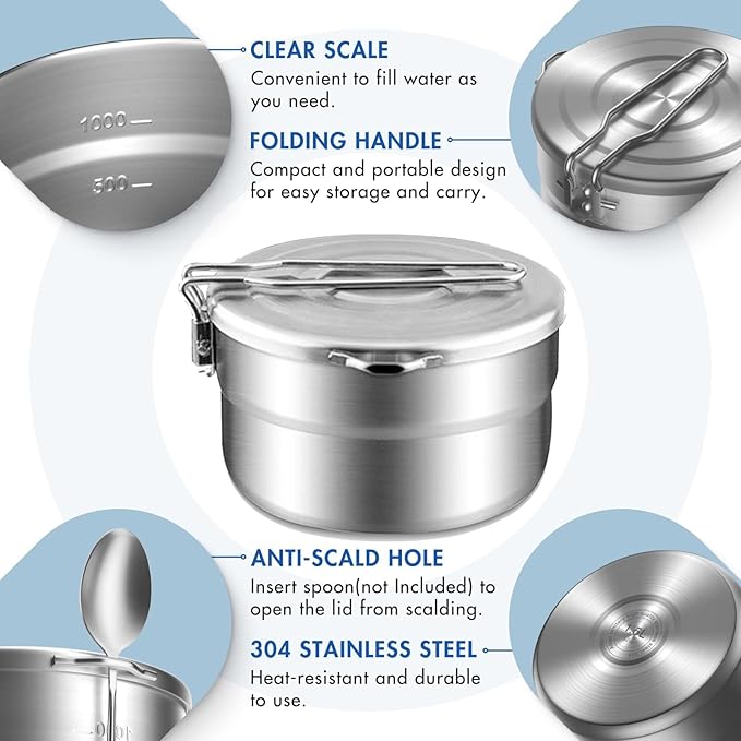 - 🍲【Efficient Heating】- The bottom of our stainless steel camping cook pot is flat, placed firmly, and it is not easy to turn over. The annular energy collection design increases the heating area, the heat transfer is fast and uniform, and the heat loss is effectively prevented. For most of your outdoor cooking and survival needs.