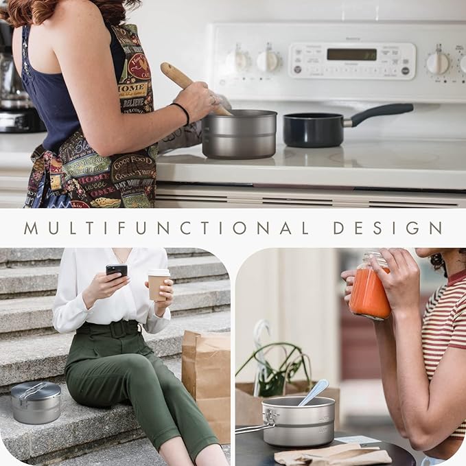 - 🍲【Lightweight, Portable & Folding Handle Design】- This ultra-light camping cooking pot is ultralight, weighted only 15.3oz (435g), applying a foldable handle design, providing a great grip, effectively preventing it from slipping out of your hand, foldable for use, saving space, and comes with a carry bag for easy storage in gear bags, behind your car and many other places.