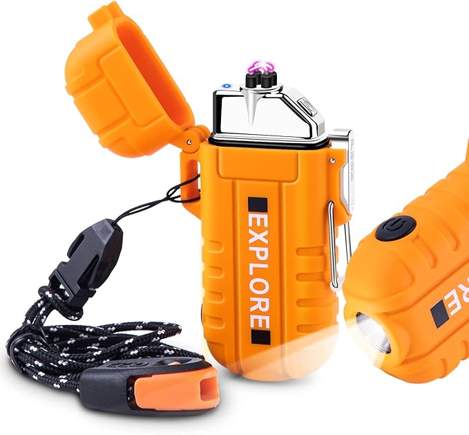 - Main Features: IP-56 dust-proof and waterproof lighter, dual arc windproof lighter, Type-C rechargeable lighter, 3 modes flashlight camping lighter and survival lanyard & whistle