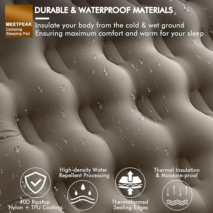 - ⛺UNIQUE INTERIOR STRUCTURE & EVERLASTING DURABILITY - Built for the outdoor activities, the sleeping pad made of durable & outdoor grade materials-40d nylon. Thermoform sealing and TPU coating make the camping pad 100% waterproof and warm which will protect you from the wet ground in the most extreme conditions. With the special internal multi-point column support and honeycomb-column air cell design, not only improve the bearing capacity but also ensure the elasticity of the mattress while not deformation. Look, prefect sleeping mat, start a nice outdoor sleeping experience.
