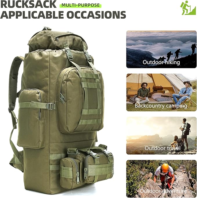 - 【Waterproof and Breathable Fabric】: The 100l tactical military backpack is made of 902D Oxford cloth fabric and waterproof material. The military backpacking bag thick density Tear Resisten Oxford cloth fabric is waterproof and wear-resistant, and the texture is tough and odorless. For traditional hiking backpacks, belts and high-quality zippers are better with durability and scratch resistance.
