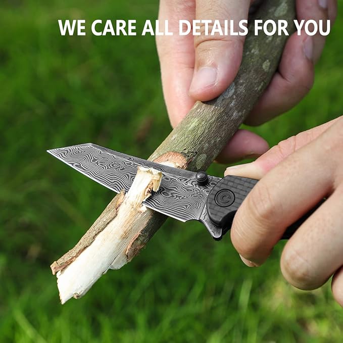 - HIGH QUALITY HANDLE - - - Twill Carbon Fiber Overlay On Black G10 Handle brings strength, durability, grip and aesthetics to the every day knife for man with gentle texturing, which helps the Pocket Folding Knife last for a very long time.