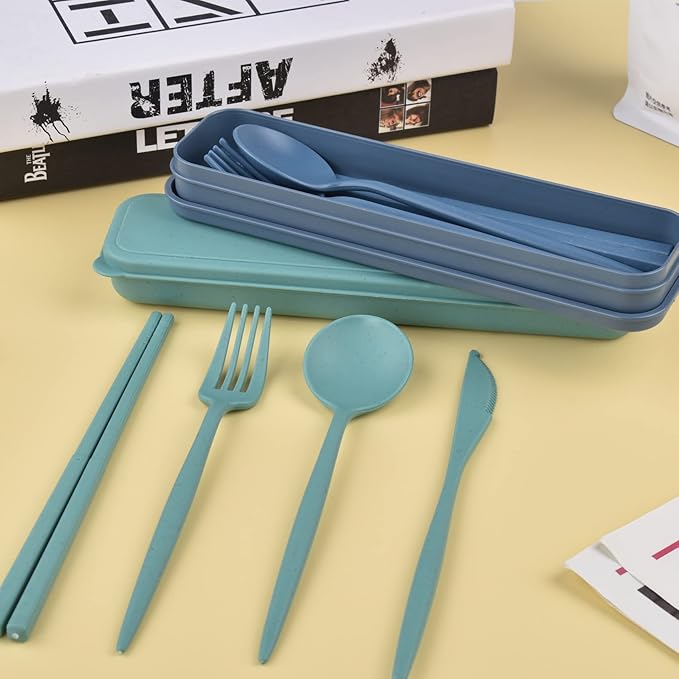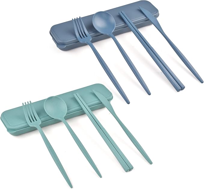 - Package includes: 2 sets travel utensils with blue and green. Each tableware case set containing dinner knife, dinner spoon, dinner fork, chopsticks and a portable travel case.