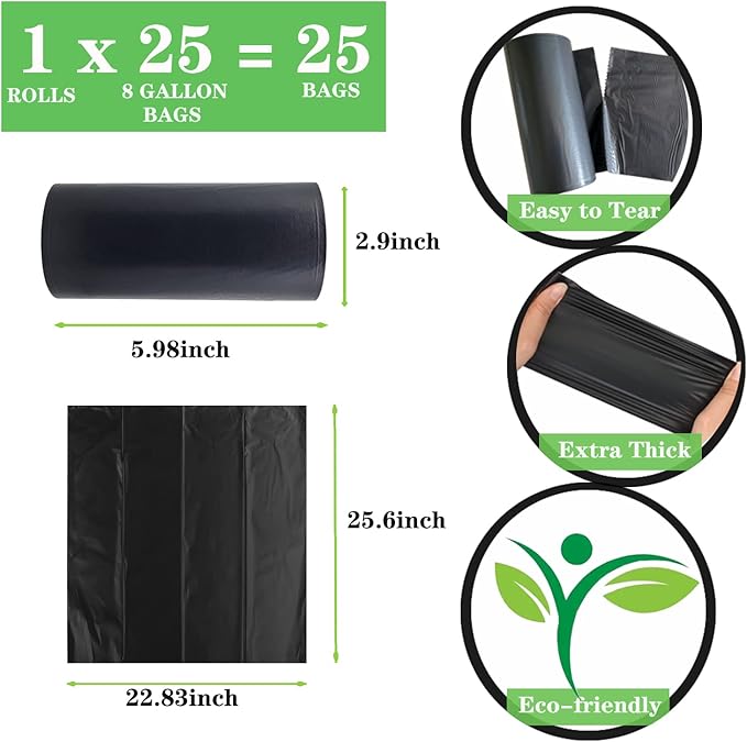 - Easy to Use: 8 Gallon/30 Liter Capacity. 22.83 in x 25.6 in; Total 25 Bucket Toilet Bags. Each 8 gallon trash bags is sturdy, convenient, and disposable. When you go camping & hiking, simply dig a hole, bury your toilet waste bags, and leave it to decompose naturally.