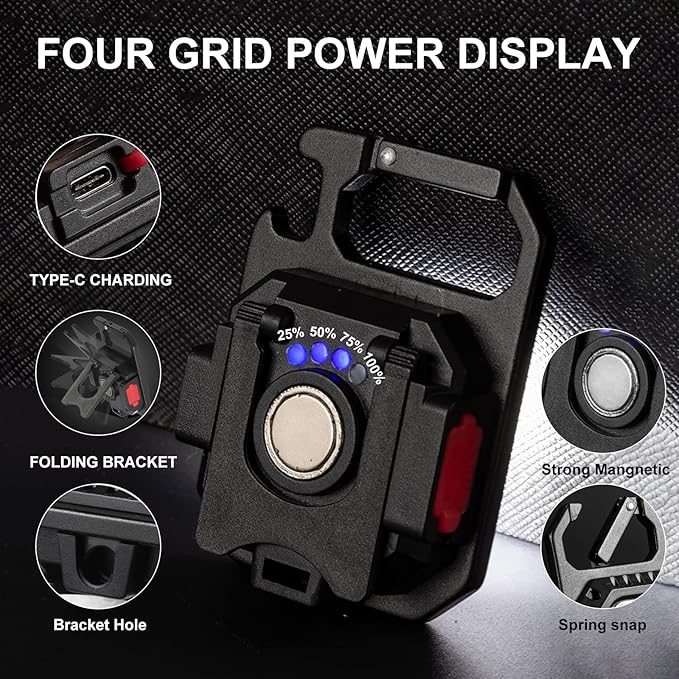 - 【POWER DISPLAY】: We all don't want to bring a flashlight with insufficient power to affect our great travel plan. The Letour team took this into account and added the power display function, so that we are no longer passive and take the initiative.This keychain flashlight can emit 1000lumens lights at maximum. It provides a bright light with a wide angle. The large COB Technical LED allows this light to be used as a small work light and emergency light.