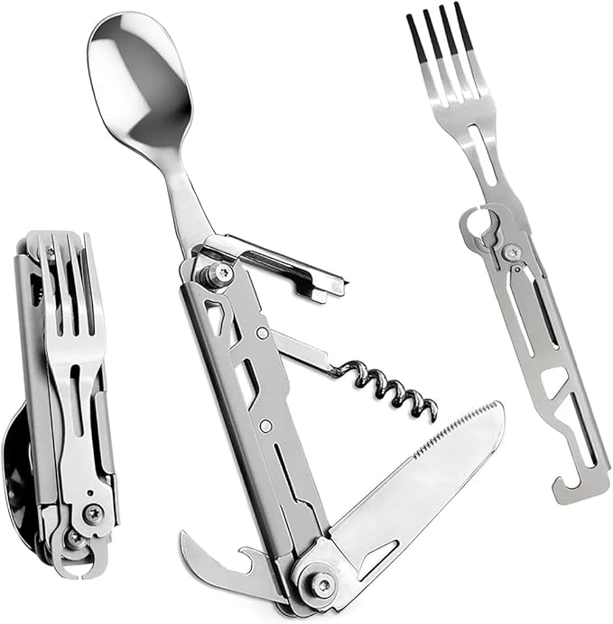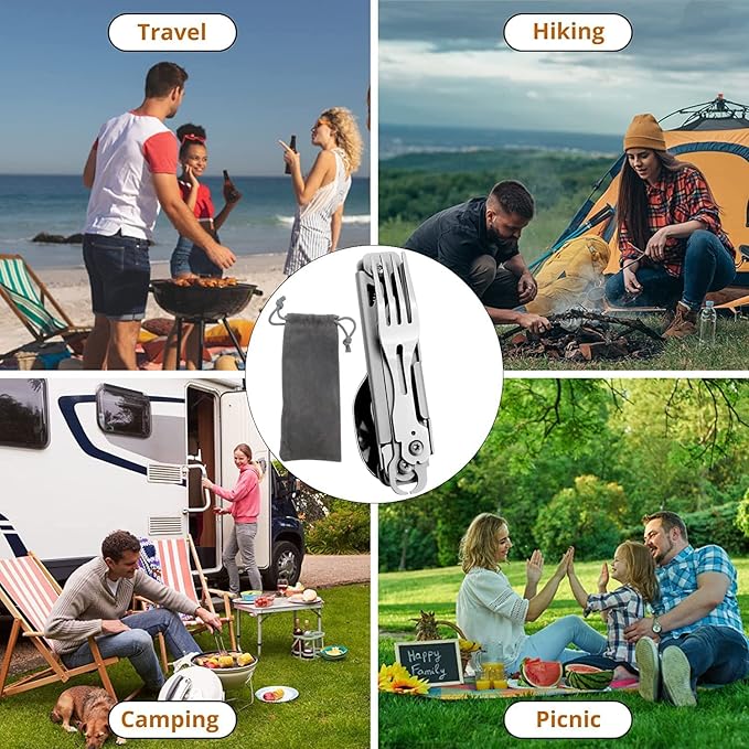 - ✔5-in-1 Folding Multifunctional Cutlery: Contains knife, fork, spoon, wine corkscrew and can opener corkscrew. Outdoor camping portable multi-function cutlery set can save space and it’s great to bring for camping, travel, office, college school, car, backpacking trip, picnic, hiking and more.