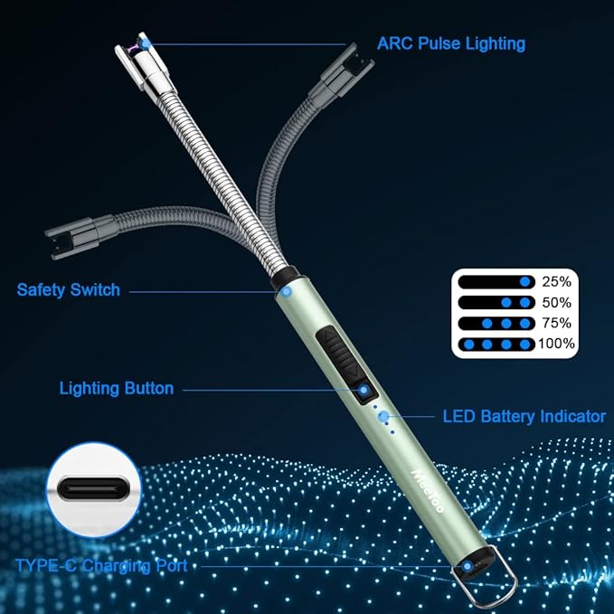 - 【360°Rotatable Bendable Neck and Butane Free】- The Arc Lighter with 360°Rotatable Neck can be bend to any angle you want to meet different applications.The electric arc will automatically turn off after 7 seconds per use. MEETOO uses plasma tech to eliminate the need for this harmful chemical.During the ignition.No more harmful butane.
