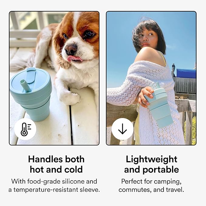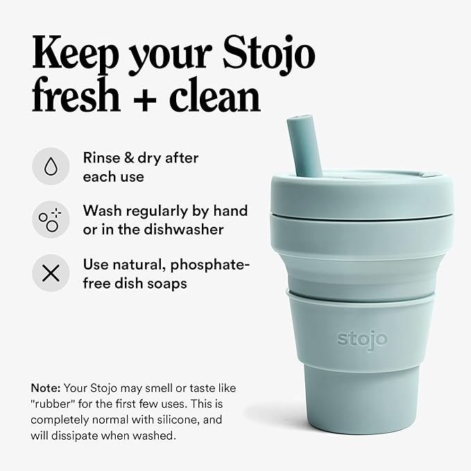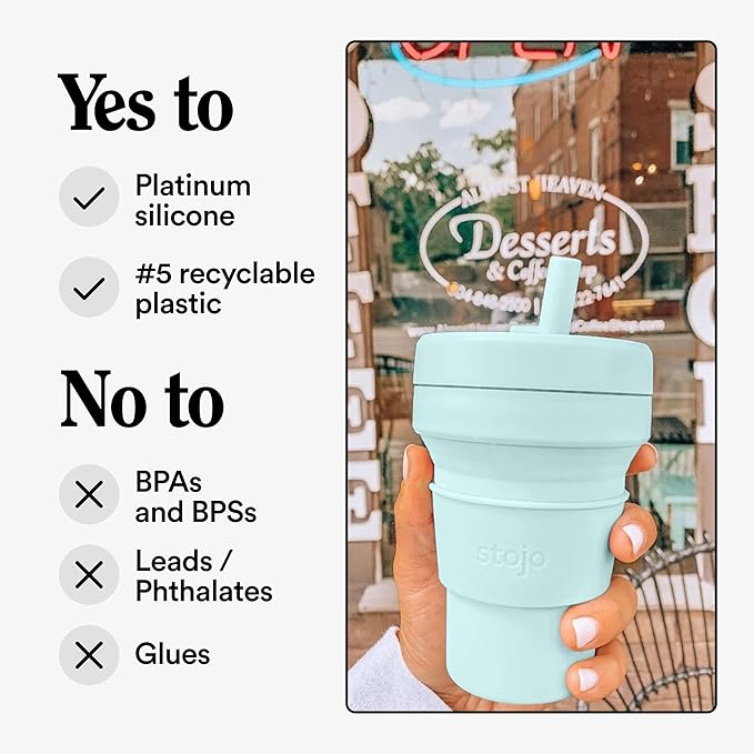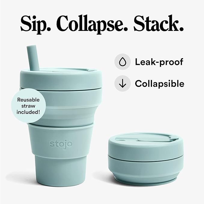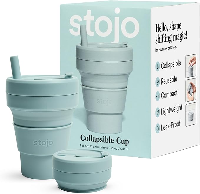 - Collapsible cup: It’s literally never been easier (or more fun) to bring your own reusable cup! This compact cup collapses down to just 2 inches. Whether you’re sipping coffee or a smoothie, the 16 oz Stojo is perfectly portable for your commute, camping trips, tea at home, and travels. When you’re done, simply remove the heat sleeve, open the tab, and collapse it down. Leak-proof, includes a straw, fits standard cupholders, and get a load of that Aquamarine Blue color!