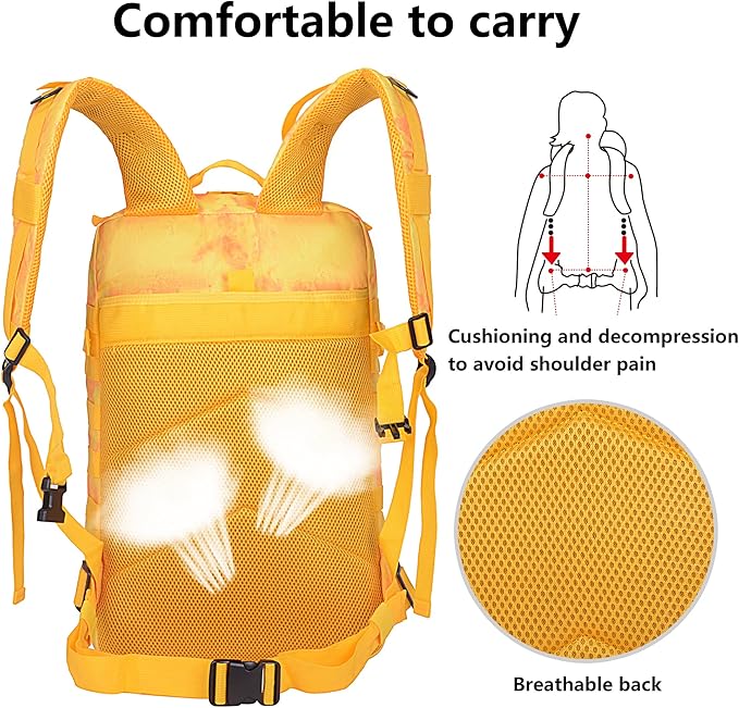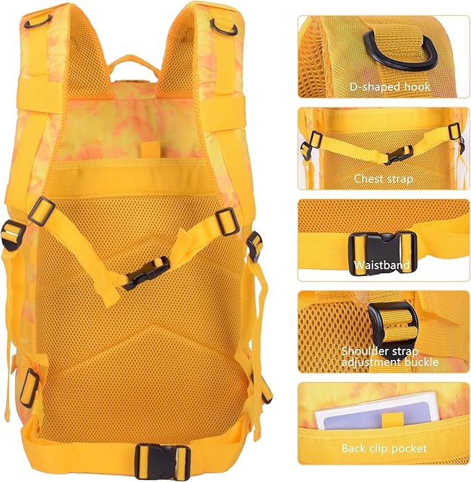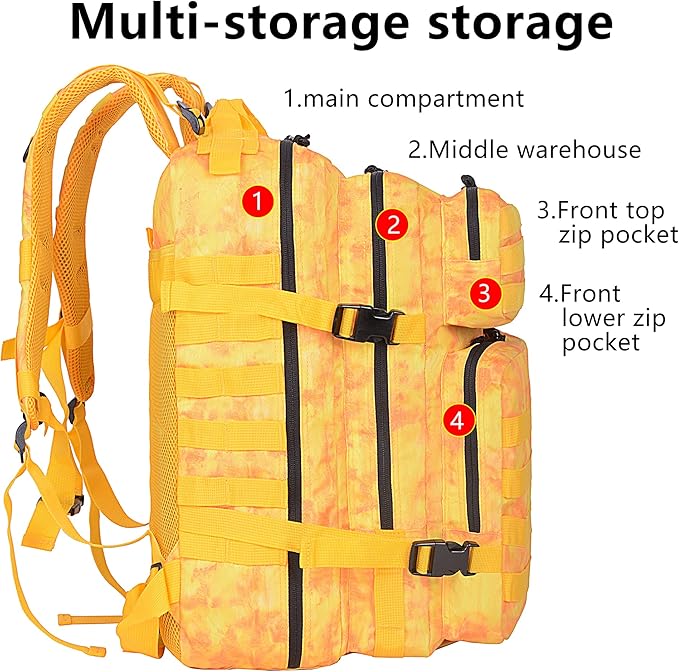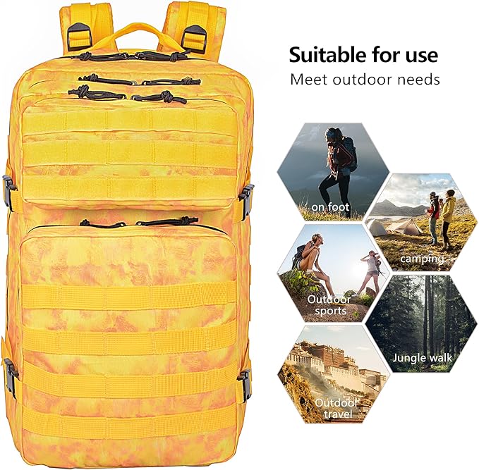 - 1. The military tactical backpack is made of 900 oxford nylon fabric, durable and waterproof, not afraid of scratches. Military backpacks are suitable for fitness, travel, hiking, camping and other outdoor activities.