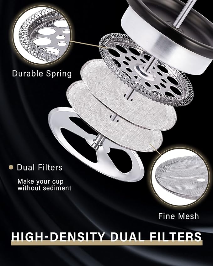 - DOUBLE WALL VACUUM INSULATION AND DUAL FILTERS - The double wall design of the french press coffee maker keeps coffee hot and the high-density dual filters structure can separate grounds from coffee perfectly, helping to make your cup without sediment and increase the smoothness of the brew. And the filters can be took apart easily for cleaning.