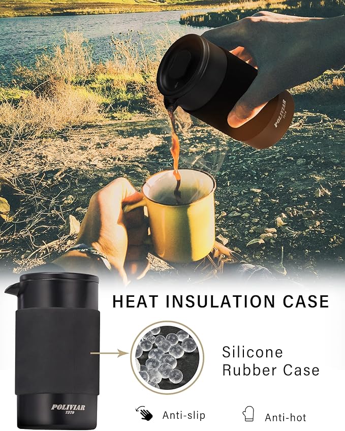 - PREMIUN QUALITY CRAFTSMANSHIP - POLIVIAR 12 OZ french press is made of 304 food grade stainless steel which is anti-rust and sturdy, taking care of user’s health and maintaining the pure taste of coffee without the metal taste when other pot does. With ergonomic designed handle,user can push and pull the plunger of coffee press easily. What is more, the travel french press with stylish long-lasting coating integrates beauty and practicality that it is a great gift idea for your friend, who is coffee lover.