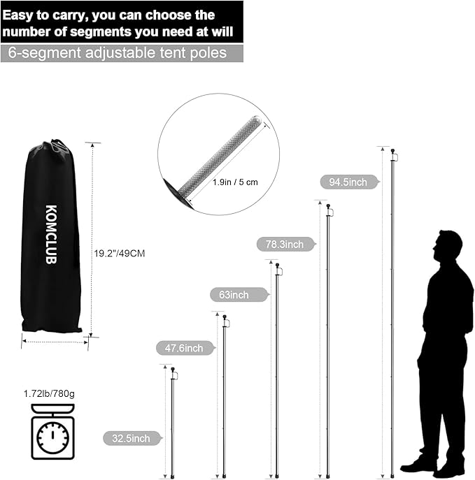 - 【Adjustable Tent Poles】 Each camping tent poles extend from 17 inch to 94.5 inches in length, allowing you to obtain the height required to stretch the tent or tarp. The lightweight awning poles are1.72lbs/780g that you won't even feel its weight and easy to carrying!