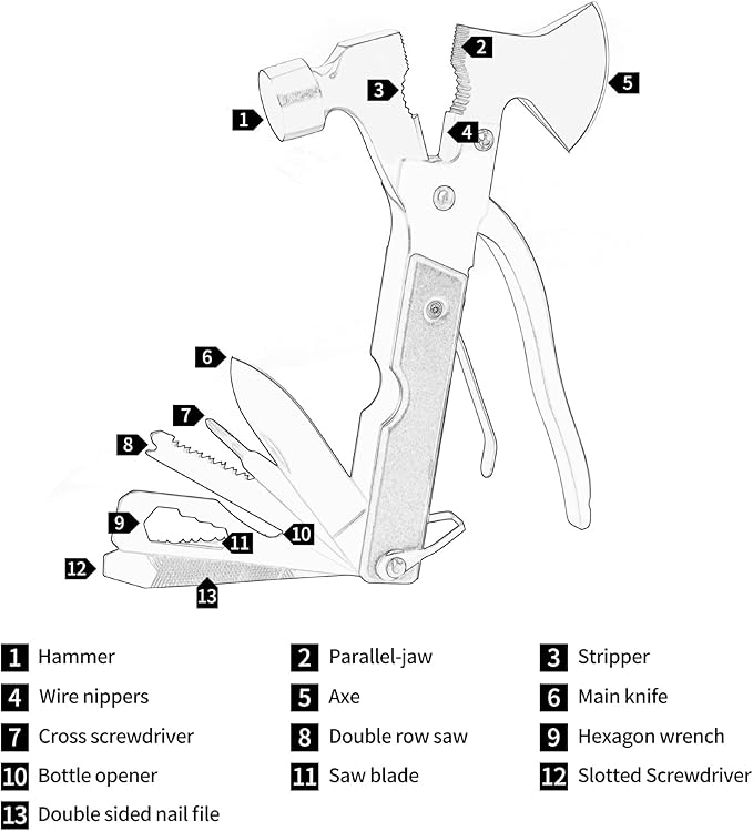 - all-in-one multi-tool includes: 13-in-1 multi-tool includes: parallel-jaw ,hammer,Main knife,Cross screwdriver,Double row saw,Hexagon wrench,Saw blade, slotted Screwdriver,Double sided nail file,axe,stripper,Wire nippers,Bottle opener and so on.