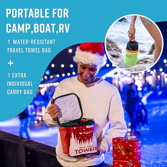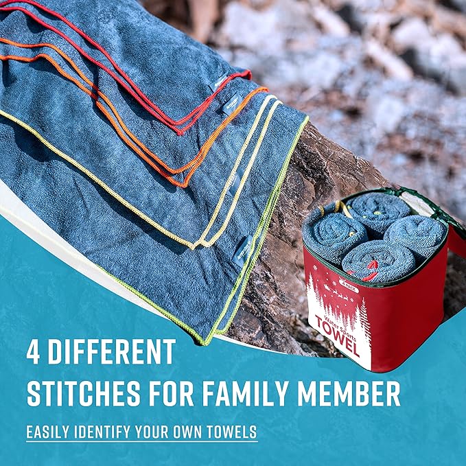 - 【Special Designed Family Pack】Awesome water resistant bag includes 4 towel and 1 extra mesh bag,a perfect choice for a family of four if you want to go camping,beaches,backpacking trips or any water sports.Each towel has a special color seam that allows family members to track their own towels.