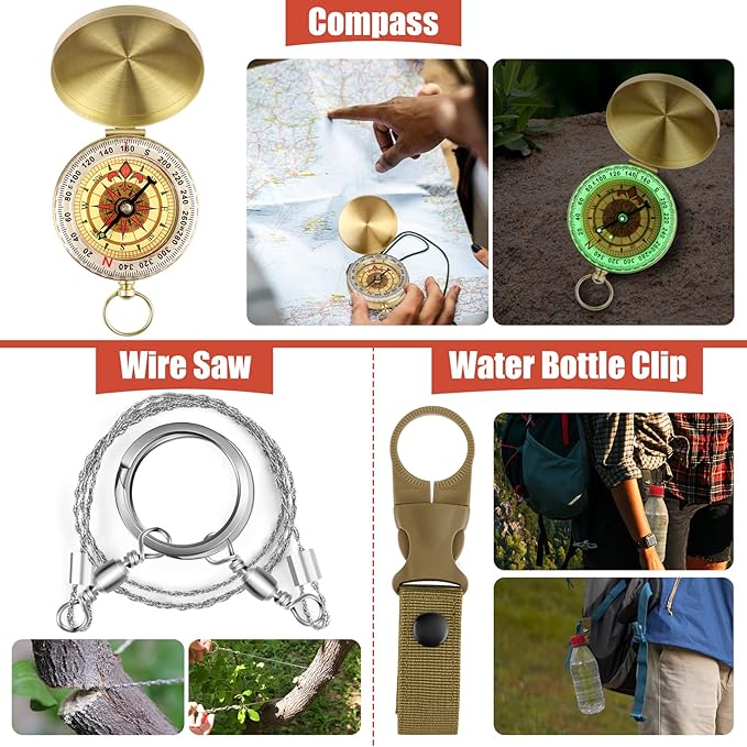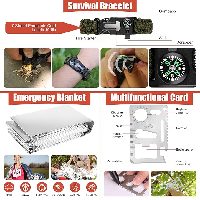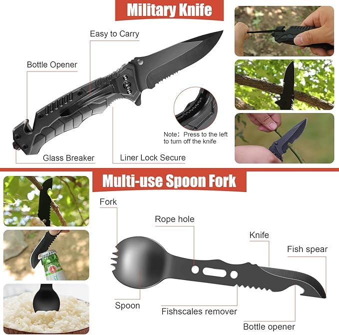 - 14 in 1 Multi Survival Kits:equipped with 14 EDC gear practical tools with multi-function , this kit includes: Water Bottle Clip, Tactical Pen,Survival Bracelet,Emergency Blanket, Fire Starter, Fire Starting Stick,multifunctional Card,Multi-use Spoon Fork,Fishing Equipment,Wire Saw,etc.