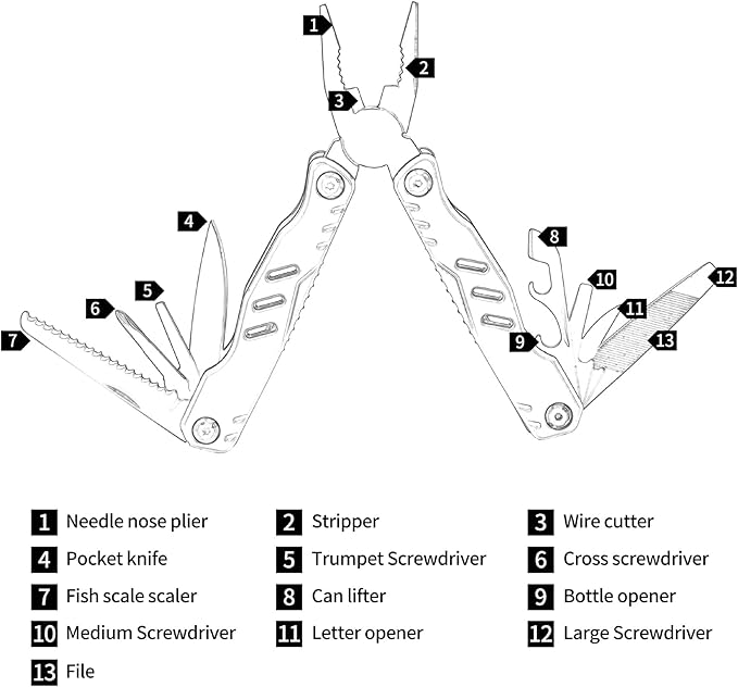 - all-in-one multi-tool includes: 13-in-1 multi-tool includes: needle nose plier, stripper, wire cutter,Bottle opener ,Can lifter,Trumpet Screwdriver,Cross screwdriver,Saw blade,Large