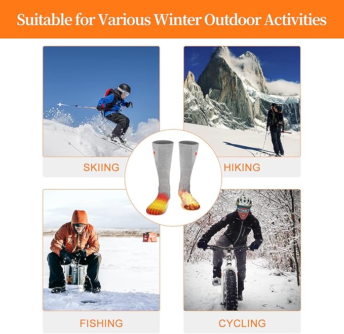 - 【Necessary for Winter】: With the electric heating socks, you can enjoy your fishing, camping, snowboarding, hunting, hiking, skiing, snowboard, and outdoor work, etc. The winter battery socks is a considerate gift for your parents, friends and family. One size for most people.