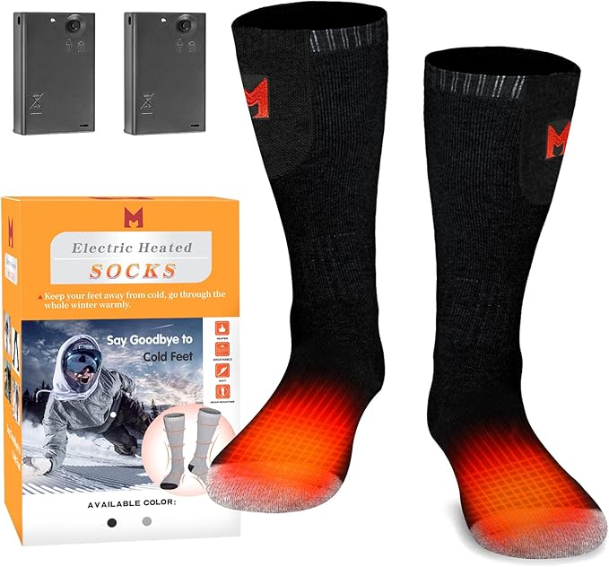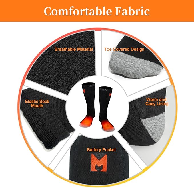 - 【Protect Your Feet】: Heating elements of the battery heated socks are made of insulated material, no worries about heating safety. Heating wire is so fine that your feet almost can not feel it. Comfortable heating temprature lets your feet no longer be cold and stiff in the cold winter.