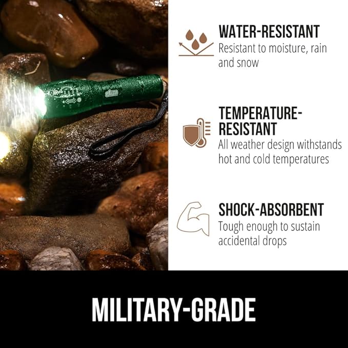 - EXTREMELY DURABLE: all weather, ultra durable aluminum alloy flashlight is shock resistant, water resistant, and temperature resistant; the perfect option for any outdoor activity; take it with you hiking, camping, biking and more; flashlight is tough enough to sustain accidental drops up to 3.3 feet as well as water submersions; includes a run time of up to 9.5 hours