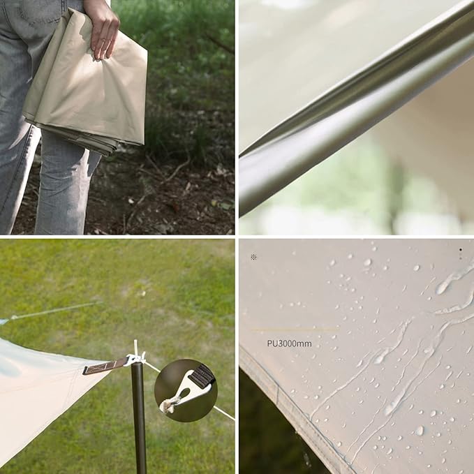 - LIGHTWEIGHT & PORTABLE: This good-quality backpacking tarp is also lightweight and portable. It only weights 1.8 pounds, very easy to pack and stuff into the storage bag. The compact tarp will not be a burden to your travel but a must have setup for hiking, camping, picnic, or beach.
