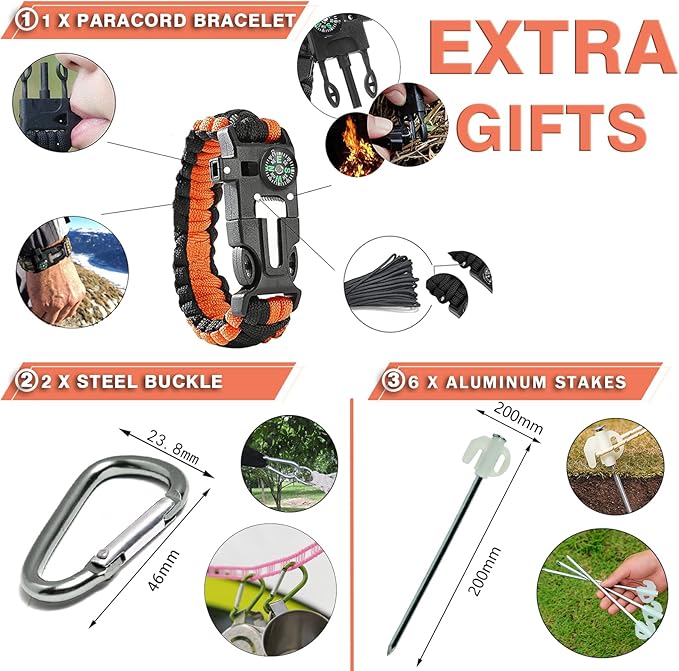 - Included Components : 1 x Camping Tarp, 1 x Portable Bag, 6 x Guylines with Adjuster, 6 x Aluminum Stake, 1 x Paracord Compass Bracelet, 2 x Carabiners Clip 1 x Camping Tarp, 1 x Portable Bag, 6 x Guylines with Adjuster, 6 x Aluminum Stake, 1 x Paracord Compass Bracelet, 2 x Carabiners Clip