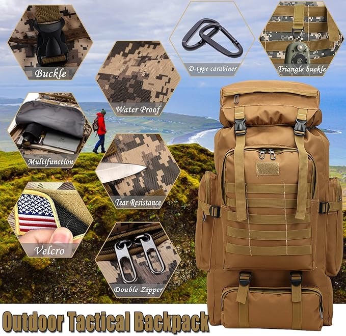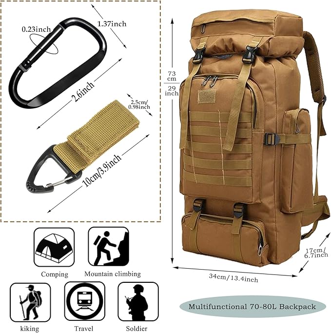 - 70L Large-Capacity: Military rucksuck is made of 600D Oxford fabric and waterproof materials, making it more robust, durable, tear-resistant, and scratch-resistant compared to other hiking backpacks. With a massive 70L capacity, this packable backpack is suitable for your one-week journey, accommodating items such as sleeping bags, clothing, shoes, notebooks, and more.