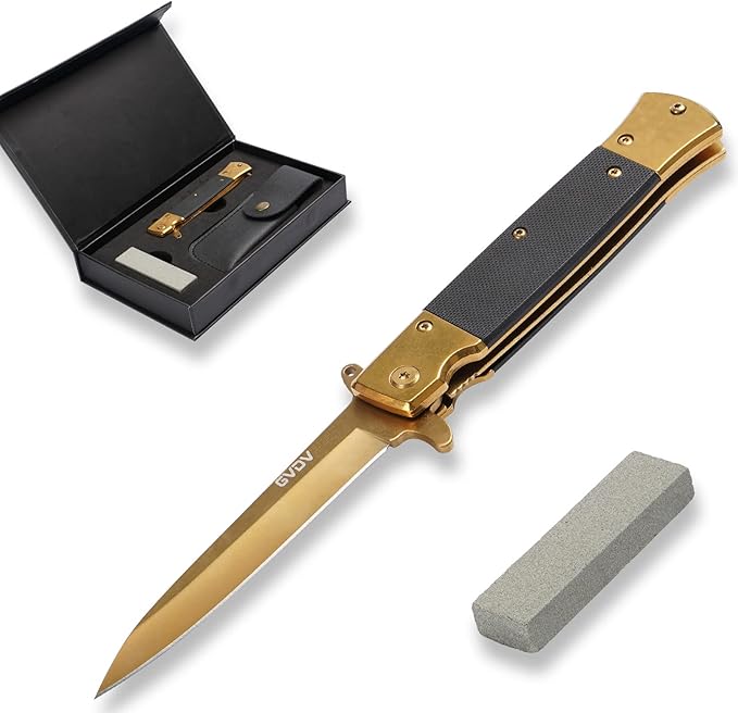 GVDV Folding Pocket Knife with G10 Handle, 7Cr17 Stainless Steel EDC Knife with Safety Liner-Lock, Camping Hunting Fishing Knife for Men Women, Gold