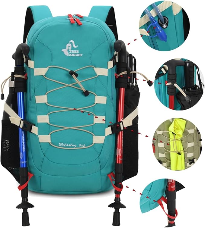 - Multi Compartment :Generous main compartments and multiple pockets allow you to keep all of your gear secure and organized.The spacious main compartment holds sleepingbag, clothes, or other everyday essentials. With one Interior Pouch for water bladder.It also has a front pocket with a zipper. The elastic cord is designed to store items that need to be easily accessible. In addition, it has two side pockets for your water bottle or umbrella.