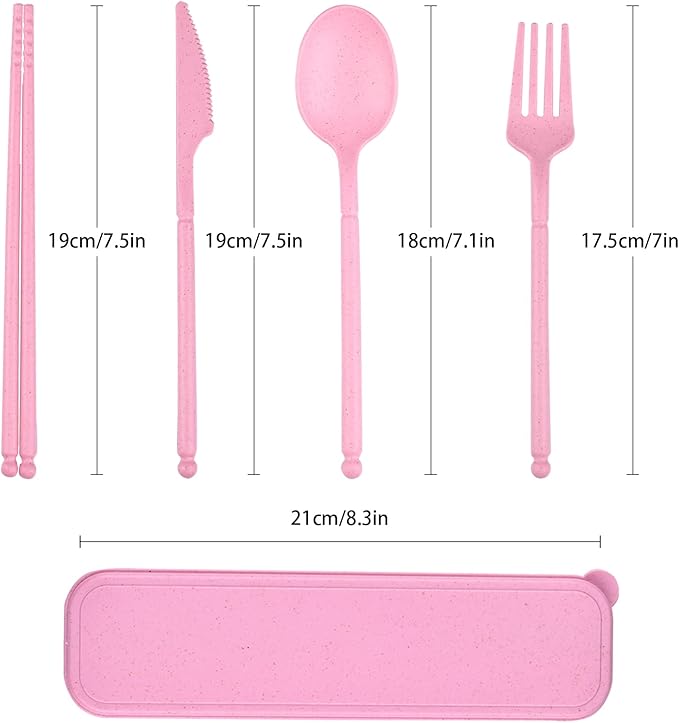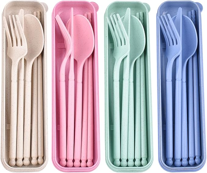 - Package Includes: 4 of set portable cutlery with pink, blue, green, beige colors, Each cutlery case set is included one fork, one chopsticks, one spoon and one knife.