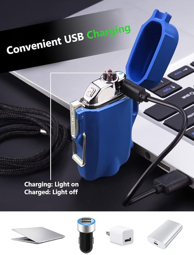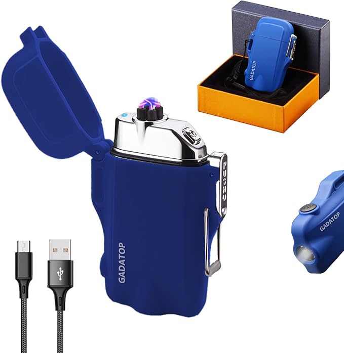 GADATOP Electric Lighter, Outdoor Waterproof Double arc Lighter Windproof Lighter, Rechargeable USB Lighter flameless Plasma Lighter with LED Torch with Lanyard, Suitable for Camping, Hiking (Blue)