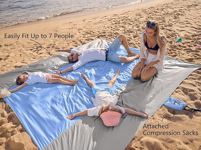 - ✔ OVERSIZED AND COMPACT-10'x9'(300cmX280cm) over 30% bigger than competing beach / picnic blanket, will comfortably fit 7 person, only weights 14 oz. Come with 6 metal stakes in a pouch for 4 anchor loops so you will have 2 spare ones just in case.