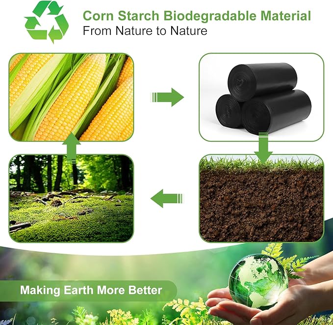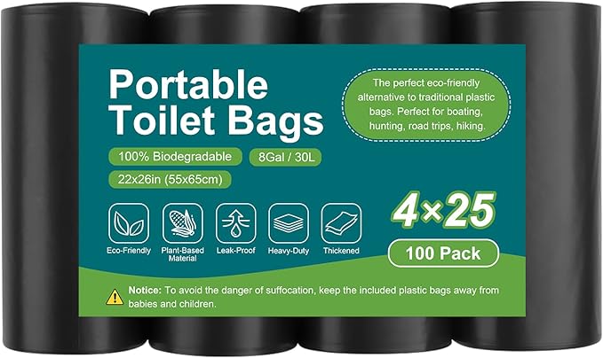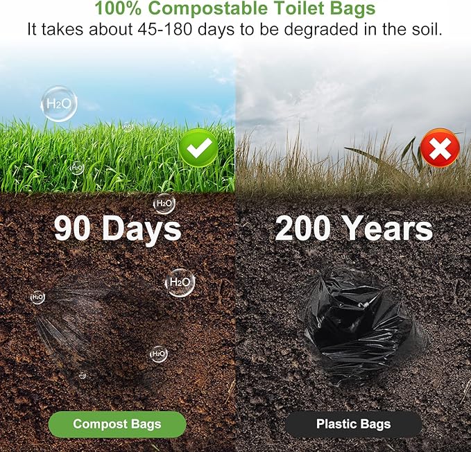 - 【100 Portable Toilet Bags for Camping】You can get 4 rolls of biodegradable toilet bags, 25 per roll, total 100 count camping toilet bags. Our portable potty bags for adults is made of corn plant starch, which can completely decompose in 45-180 days, become a part of soil. Using compost bags 8 gallon trash bags will not pollute the environment.