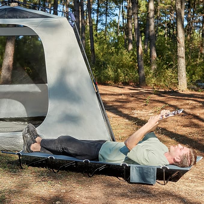 - STORAGE: The camping sleeping cot has side pocket to put the cell and night time necessities, makes your camping experience so much more enjoyable