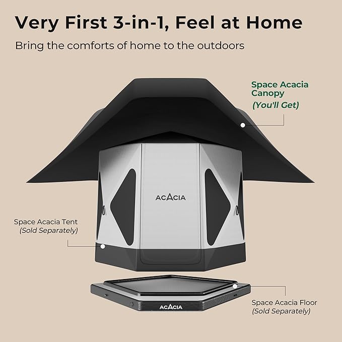 - 3-IN-1 NEW CAMPING SYSTEM: The Space Acacia consists of a spacious, modern glamping tent, the first-of-its-kind proprietary air floor and the innovative, temperature-adjusting canopy. All 3 thoughtfully designed components work in harmony to enable you to live an indoor lifestyle, outdoors.