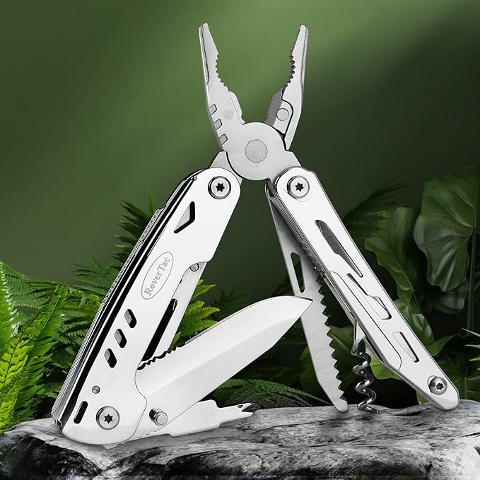 RoverTac Multi Tool Pocket Knife Tactical Camping Survival Knife Gifts for Men Dad Husband 18 in 1 Multitool Pliers Scissors Saw Corkscrew Bottle Opener 9-pack Screwdrivers Safety Lock Nylon Sheath