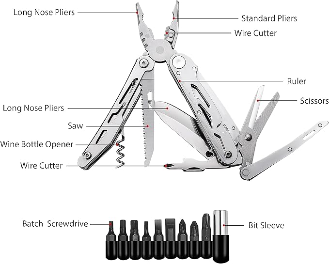- 18-in-1 Multi Tool: Features 18 different tools including Pliers, Knife, Scissors, Saw, 9-pack screwdriver bits, Wire Cutter, Wine/Bottle Opener, Ruler into one multitool
