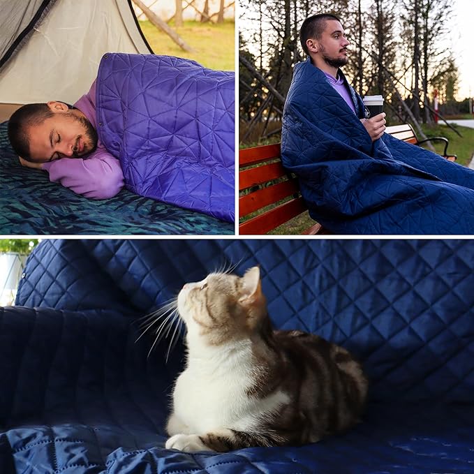 - TERRAIN LINES QUILTED:Ultrasonically quilted technology can ensure closer combination of 210G waterproof Oxford and 235Gpolar fleece materials, The 100G cotton interlayer in the middle makes the camping blanket more flexible and warm.