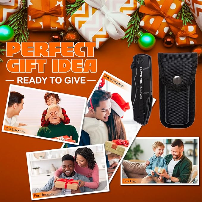 - HIGH-QUALITY & UNIQUE: The upgraded tactical knife is made of prime 440C stainless steel and aluminum, special material makes this men's gift higher quality. The surface of the folding knife is finished with a black oxide coating, which provides good rust resistance. The engraved "I LOVE YOU FOREVER" passionately expresses the deep love for the recipient.. IT’S A UNIQUE GIFT FOR MEN.