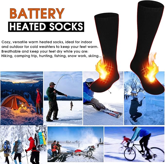 - 【Soft Breathable Insulated Material Thermal Socks】This warm winter socks made with Premium spandex fabric cotton,absorbent breathable,quick drying,elastic thickened,heat insulated and electric module using. Package including: A pair of heated socks, 2pcs batteries, 1pcs AC dual charger, 1pcs user manual and luxury packing box for gift ideal