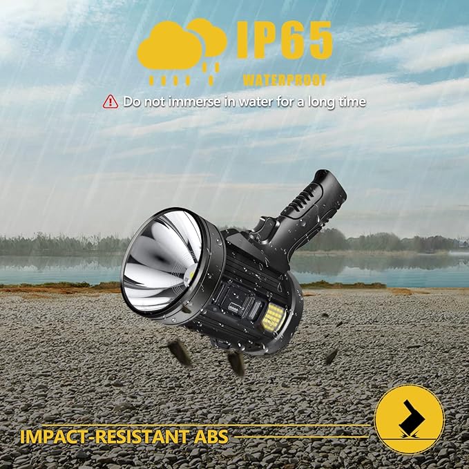 - IP65 WATERPROOF: This handheld spotlight is rated IP65 waterproof, meaning it can effectively prevent splashes of water from all sides. Whether you're facing rain, snow, or other wet conditions, you can rely on this spotlight to remain functional and keep illuminating your surroundings.