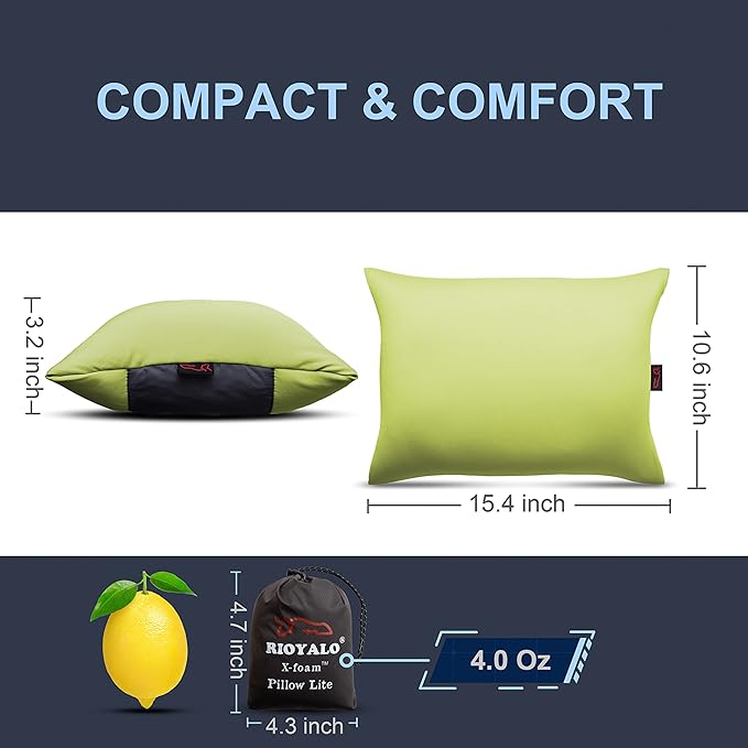 - [ SMALL & ULTRALIGHT ] Weight only 4.0 Oz, with the compact Lemon-sized compressible pack, RIOYALO X-FORM Pillow Lite is the best combination of packable space, comfort and weight. Idea for camping, backpacking, hiking, traveling and trekking.