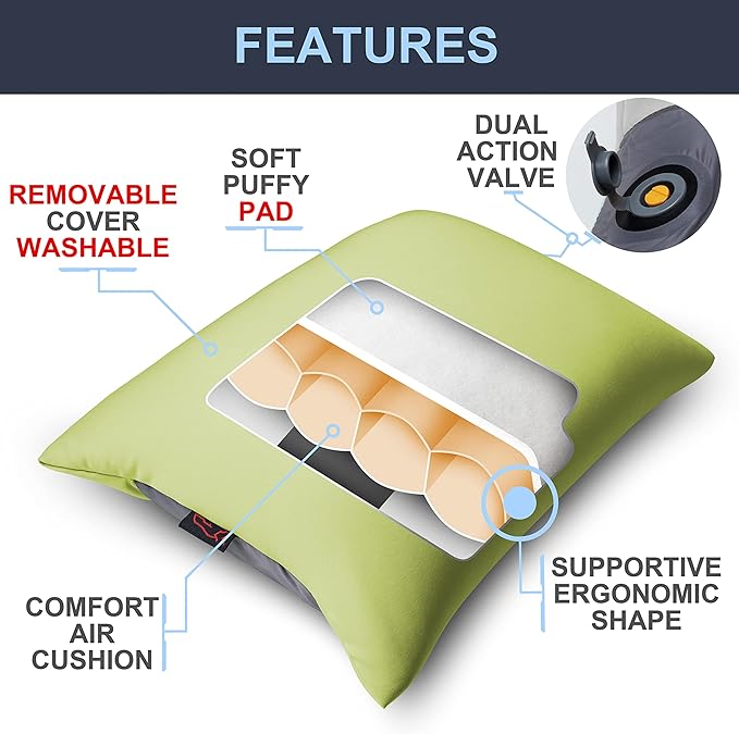 X-Foam Inflatable Camping Pillow Lite with Removable Foaming Cover | Comfortable, Washable Ultralight Portable with Neck Lumbar Support | Backpacking, Hiking, Travel, Air | Small (APPLE GREEN)