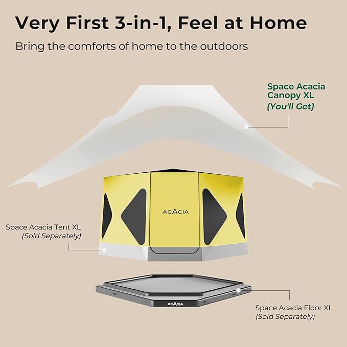 - 3-IN-1 NEW CAMPING SYSTEM: The Space Acacia consists of a spacious, modern glamping tent, the first-of-its-kind proprietary air floor and the innovative, temperature-adjusting canopy. All 3 thoughtfully designed components work in harmony to enable you to live an indoor lifestyle, outdoors.