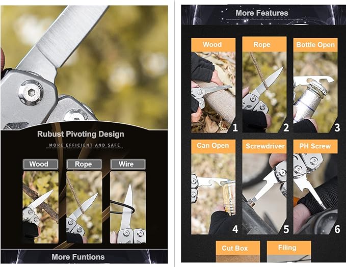 - 【Versatility and Value】This 14-in-1 multitool offers unbeatable value for its functionality and quality, which includes variaous tools such as long nose combination pliers , wire cutter, knives, wood cutting saw, single/cross cut file, Philips/ slotted screwdrivers, scraper, hook remover, bottle opener, can openers. Ideal for camping, fishing, hunting and outdoor surviving, etc.