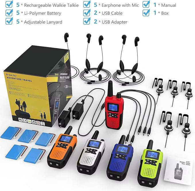 - Included Components : Walkie Talkies for Adults Working, Kids Playing, High-Capacity Batteries for Extended Talk Time, USB Charger Y Cable for Fast Simultaneous Charging, Original Earpiece and Mic Sets for Private Chats, Belt Clips & Adjustable Lanyards for Ease of Carry Walkie Talkies for Adults Working, Kids Playing, High-Capacity Batteries for Extended Talk Time, USB Charger Y Cable for Fast Simultaneous Charging, Original Earpiece and Mic Sets for Private Chats, Belt Clips & Adjustable Lany… See more
