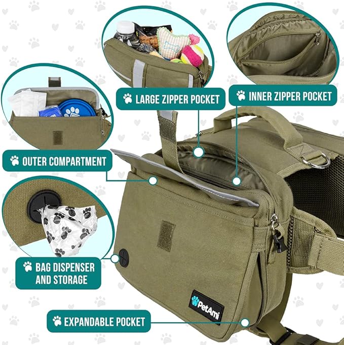 - FUNCTIONAL COMFORTABLE DOG BACKPACK: This dog saddle bag is designed with utility in mind for both the owner and your best friend. Multiple pockets with adjustable fits ensure this pack fits snuggly on your dog while holding all essentials such as food, treats, doggie bag, first aid supplies and travel bowls.