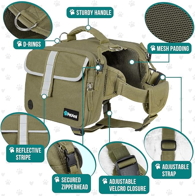 - FUNCTIONAL COMFORTABLE DOG BACKPACK: This dog saddle bag is designed with utility in mind for both the owner and your best friend. Multiple pockets with adjustable fits ensure this pack fits snuggly on your dog while holding all essentials such as food, treats, doggie bag, first aid supplies and travel bowls.