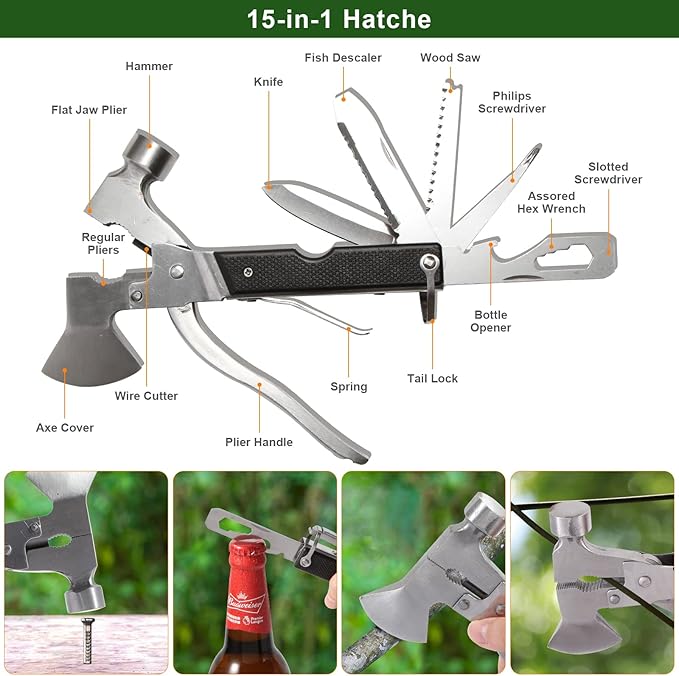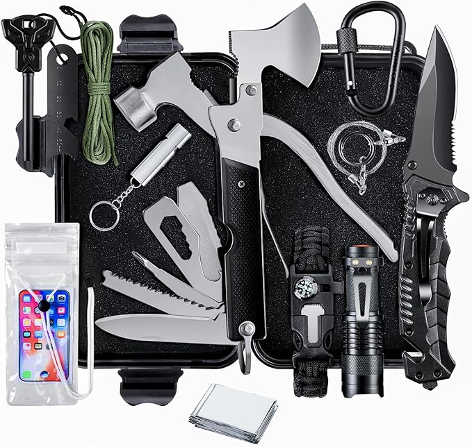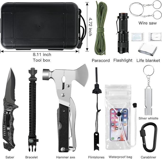 - 13 in 1 Survival Gear and Equipment: Survival kit contains the practical tools you need when an emergency occurs. 14 in 1 survival axe, 8 in 1 survival knife, 6 in 1 survival rope bracelet, fire starter, waterproof case, flashlight, wire saw, metal Lanyard, umbrella rope, silver whistle, waterproof bag, first aid blanket, waterproof cell phone bag, etc. Suitable for men, women, parents. It's a cool gadget for boys and girls.